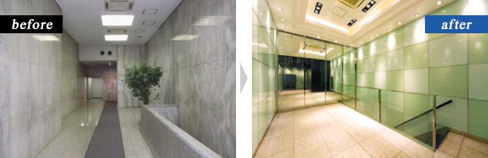 竣工時(約50年前)からのエントランスを現代のマーケットに対応したモダンで明るいエントランスにバリューアップした事例です。