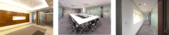 中央部にガラス張りの大会議室を配置し、その周りを各室がとり囲むレイアウトにより、ガラス素材を活かした明るく開放的なオフィスに仕上げた入居工事の事例です。