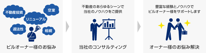 - ビル運営をされている上で様々なお悩みはたくさんついてまわります。当社のコンサルティングでは独自のノウハウでオーナー様の持つお悩みを解決に導きます。