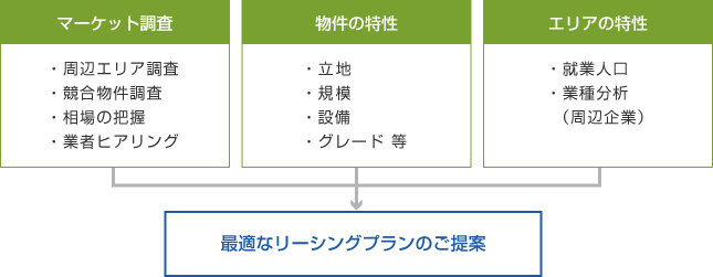 また、当社独自の情報ルートの活用、長年培った業界ネットワークを活用し最適なリーシングプランをご提案いたします。