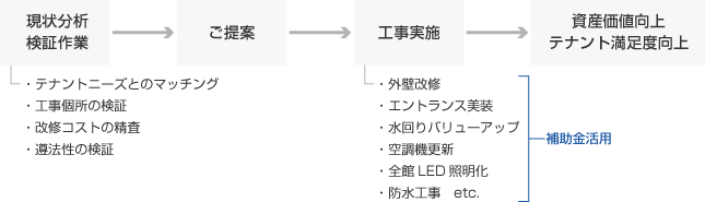 また、新規に入手された建物の遵法化対策工事についても、調査・提案します。
