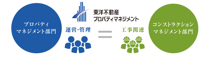 - 当社のプロパティマネジメントは、社内の他部門と連携することにより他社とは違う相乗効果を生み出します。ビル運営に必須の改修工事などは、自社コンストラクションマネジメント部門でも請け負っているため工事に関するノウハウや金額面の調整に自信を持っています。