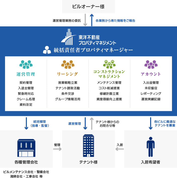 - 当社ではプロパティマネージャーが統括責任者として、テナント誘致から、その後のご契約、各種工事、オーナー様へのご報告まで一貫したビル運営を行なっています。